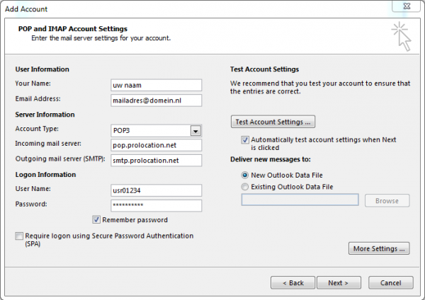 - Vul bij Server voor uitgaande e-mail (SMTP) in: smtp.prolocation.net of relay.prolocation.net